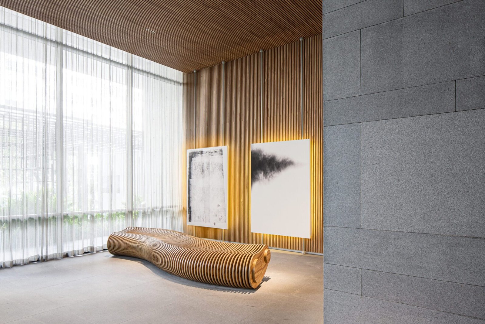 Yes, the Infinito bench, in its wooden version, complements the design of the entrance hall, contrasting its organic form with an environment featuring a high ceiling and well-defined lines.