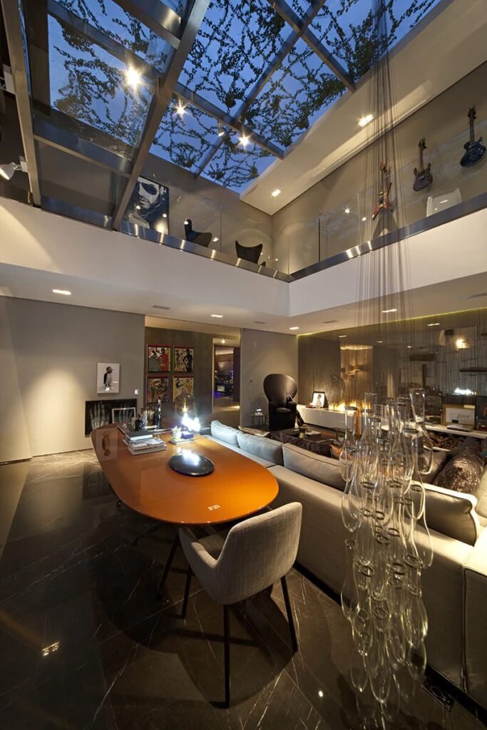 In practice, it’s a double-height living room, with two levels, where a metal and glass walkway connects the different levels of the space. An exuberant construction, something idyllic for a project of its proportions. “My client can afford these excesses,” jokes the architect, having in mind rock star Lenny Kravitz, her immediate inspiration for the creation.I met him a short time ago in Milan. Of course, I was already a fan. But I became even more so when I learned that he was a great admirer of art and interior design.